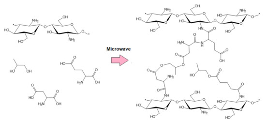 FTIR spectra of the raw fungal chitosan, Gel-1, Gel-2, Gel-3, and Gel-4 samples containing plant extract prepared using commercial Kalanchoe pinnata extract are given in Figure 7. FTIR results are presented in Table 3. The raw chitosan spectrum shown is typical for this polymer band. First, the band coming from free hydroxyl and amino groups with the maximum at 3359 cm−1 is visible. The presence of NH2 moieties is confirmed also by the bands at 1576 cm−1 and 1154 cm−1. The band at 1653 cm−1 corresponds to amide bonds present in acylated units of the CS. In addition, bands coming from glycosidic bonds as well as glucopyranose rings are visible at 1029 cm−1 and 885 cm−1 [12,15,16,31]. CS crosslinked with amino acids shows some significant changes in the bands’ intensity. On the contrary to the commonly applied methods using glutaraldehyde as a crosslinking agent, there is no decrease in the free amino groups’ intensity. Since amino groups are prone to react, the crosslinking process occurs between the carboxyl groups of L-aspartic and L-glutamic acid and amino groups present in glucosamine units, due to which bands coming from free amino groups are of higher intensity compared to the native CS (1576, 1755, 1581, 1573, 1154, 1148, 1148 and 1154 cm−1, respectively). Importantly, when comparing collected spectra to other researchers’ data, a significant difference in amino groups content is visible [12,15,16]. Covalent bonds formation proves bands typical for amides at 1658, 1633, 1645, and 1651 cm−1, respectively. In each case, wide overlapping bands coming from free hydroxyl and carboxyl groups at 3229, 3229, 3250, and 3208 cm−1 are visible [31]. The presence of Kalanchoe pinnata extract confirms bands at 1732 cm−1 and 1738 coming from carbonyl groups as well as bands around 1400 cm−1 coming from unsaturated carbon double bonds as well as bands around 1600 cm−1, which can be assigned to C=C aromatic ring stretching vibrations [29,30]. All FTIR spectra exhibit also glycosidic bonds and glucopyranose rings typical for CS [31]. Basing on the obtained results, the proposed reaction scheme has been presented in Figure 8.