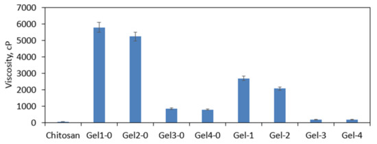 The chemical crosslinking resulted in the change of the CS viscosity as given in Figure 10. Native CS has a linear structure and contains N-acetylglucosamine as well as glucosamine mers linked with glycosidic bonds. Thus, it easily dissolves in acidic solutions whose viscosity is very low (52 cp). The crosslinking process leads to the formation of cross bindings; thus, a crosslinked structure is obtained. On the other hand, this fact makes the polymer insoluble in aqueous solutions, which instead of dissolving undergoes swelling without losing their shape and structure. To verify the effect of crosslinking conditions on the raw CS, newly prepared hydrogels directly after crosslinking were placed in the acetic acid solution, and their viscosity was determined. As one may notice, in the case of samples Gel-1-0 and Gel-2, numerous covalent bonds have been formed, leading to the highly crosslinked and tight structure formation, which resulted in the significantly higher viscosity. Samples Gel-3-0 and Gel-4-0 also were very viscous (800–900 cp). To prepare hemostatic materials, raw hydrogels were lyophilized. The products in their final form were characterized by reduced viscosity, which can be assigned in the change of their porosity and spatial architecture due to the dry-freezing process. It is noteworthy that such viscosity behavior is typical for hydrogel materials and enables distinguishing physical and chemical ones [32,33,34,35,36].