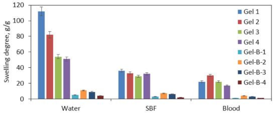 Swelling properties study in different swelling media (distilled water, simulated body fluid (SBF), and blood) of Gel 1–4 hemostatic agents in the form of a patch; Gel-B-1–4 hemostatic agents in the form of beads.