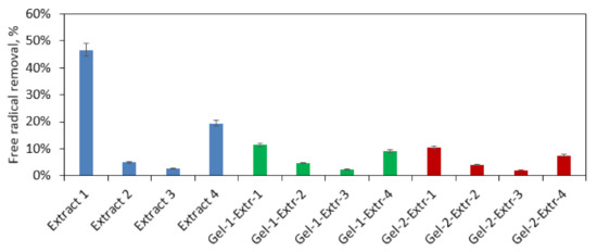 The formation of a wound as a result of skin damage may lead to oxidation stress, which negatively affects the healing process. Therefore, additional biological activity leading to the free radical scavenging is a highly desired feature for modern biomaterials. HemA modified with four different extracts was investigated for its antioxidant activity (Figure 12). The performance of Extracts 1 and 4 as well as samples Gel-1-Extr-4 and Gel-3-Extr-1 can be considered as significantly different. The results given in Figure 3, Figure 4 and Figure 5 have shown that all of them contain phenolic and polyphenolic compounds responsible for free radicals’ neutralization. To verify this feature, the extracts and two samples characterized by best swelling capacity (Gel 1 and Gel 2) were used to study their antioxidant behavior. The highest biological activity was obtained for commercial extract followed by the extract prepared using 95% ethanol solution subjected to ultrasounds treatment, which were able to remove almost 50% of DPPH• (Extract 1) and nearly 20% (Extract 4), respectively in only one hour. Further tests were carried out for extracts immobilized inside hemostatic agents’ matrixes. One may observe that after 60 min, biomaterials have neutralized more than 10% of free radicals (Extract 1 and 4). For Extracts 2 and 3, the amounts of free radicals being removed were similar for the solutions being tested alone and for ready biomaterials. Kalanchoe pinnata is a plant known for its antioxidant activity, which can be assigned to the phenolic and polyphenolic compounds present in its leaves [24]. On the other hand, CS due to the free amino groups as well as secondary hydroxyl moieties content also possesses the ability of free radicals’ removal. The significantly higher antioxidant performance of the raw extract is explained by the easier access to DPPH•, which is much hampered due to the strict and compact form of the hemostatic agents. However, comparing evaluated biomaterials activity to similar products, the antioxidant activity is considerably higher [31].