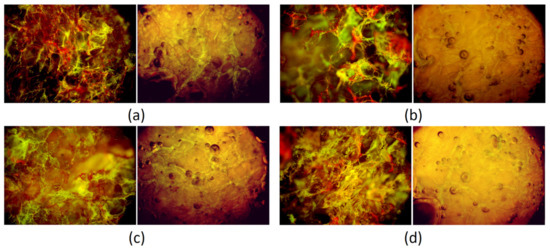 Cytotoxicity was evaluated by quantitative and qualitative methods according to ISO 10993 standard for biomedical devices. For this purpose, L929 mouse fibroblasts were cultured under standard conditions (high humidity, 5% CO2, 37 °C). The cell culture medium was changed every 24 h. Cells’ proliferation assay based on the tetrazolium salt reduction (XTT assay) was carried out according to the producer’s protocol (Roche) after 48 h. The colorimetric reaction was investigated using a microplate reader at 450 nm. To evaluate cytotoxcicity by direct method, the cells were seeded inside the 24-well plates containing 10 mg of each sample. Their morphology was observed under an inverted microscope equipped with an epifluorescence adapter (Delta Optical, Zielona Góra, Poland) after 72 h of culture.