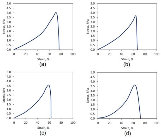 Biomaterials dedicated for topical applications should be characterized with appropriate mechanical properties to maintain their integrity after swelling with body fluids and not tearing to release smaller fragments, which may contaminate the wound. Hydrogels depending on the polymer used for their preparation are characterized by varied durability. Natural raw materials are mostly characterized by lower resistance to mechanical factors than synthetic ones. Figure 17 shows the results of TS evaluation performed on the “dog bone”-shaped samples swollen with SBF. Raw CS is characterized by low endurance. The crosslinking process leading to the formation of bridges from L-aspartic and L-glutamic acid molecules between linear chains leading to crosslinked structure formations enhances this feature. A crucial factor affecting the increased durability is the formation of covalent amide bonds between free amino groups coming from CS and carboxylic moieties present in amino acids. Figure 17 shows the tensile strength for the Gel-1, Gel-2, Gel-3, and Gel-4 samples. The highest mechanical durability was obtained for the sample Gel-1, whose TS was above 4 kPa and had a strain of almost 80%. Other samples’ TS value were slightly below 4 kPa. Such results correspond to other researchers’ data [38,39,40,41] and suggest that the prepared biomaterials durability is at the satisfactory level for topical hemostatic agents’ applications.