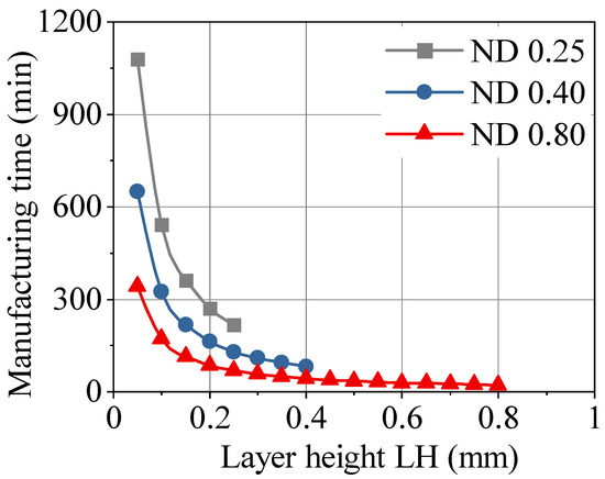 Manufacturing time vs. layer height depending on the nozzle diameter.