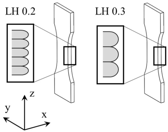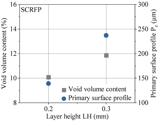 The results for the quality assessment are summarized in Figure 6. The non-destructive testing by µCT gives the internal defects of AM polymers. Manufacturing with higher LH leads to higher internal void volume content, which is consistent with previous studies [33]. The external quality assessment was executed using a 3D laser scanning microscope within the gage section (1). The results indicate an increasing primary surface profile by increasing LH. This finding confirms the current literature, in which the layer height has a direct influence on the surface quality in terms of waviness and roughness [2,28]. In order to specify the manufacturing quality, Figure 7 illustrates the original as built surface of the specimens for different LHs. The combination of the quantitative results of the primary surface profile and the visualization clarifies the difference in manufacturing quality for LH 0.2 mm and LH 0.3 mm.