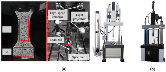 Experimental setup for high-speed tests: (a) HTM 5020 for tensile loading; (b) HITS-TX 10 for shear loading.