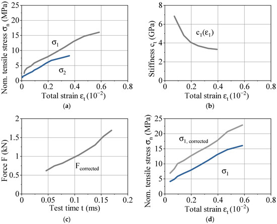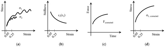 Schematic data processing for high-speed tensile testing: (a) stress vs. strain diagram based on raw data for gage and dynamometer section; (b) stiffness vs. strain within the gage section; (c) corrected force vs. entire test time; (d) corrected stress vs. strain in the gage section.