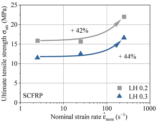 Within the test series, the smaller LH 0.2 achieves the higher ultimate tensile strength over the entire range of strain rates. The degradation of material capability with increasing LH under quasi-static loading conditions is well known [35], the material behavior with increasing strain rate is introduced with this work. The strength reinforcement tendency due to higher strain rates is considered as almost identical between 2.5 and 250 s−1 for LH 0.2 and LH 0.3.