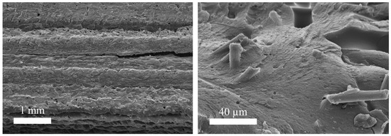The investigations of fracture behavior indicate the main failure mechanisms within the test series under tensile loading. Figure 10 shows an exemplary fracture surface of the specimen with LH 0.3 mm tested at a strain rate of 250 s−1. The fracture surface with low magnification indicates matrix cracking and interlayer debonding. The matrix cracking occurs both between and within extrusion beads. Failure between extrusion beads in manufacturing direction z is equivalent to an interlayer debonding. The fracture surface with high magnification demonstrates the additional failure mechanism of fiber pull-out. These failure mechanisms under high strain rates are consistent with current literature [36]. Furthermore, the internal quality is represented by visible voids.