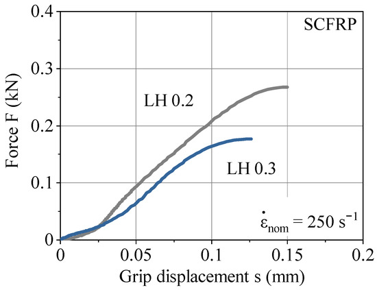Force vs. grip displacement for LH 0.2 and LH 0.3 at a strain rate of 250 s−1.