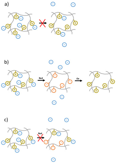 Sketches for encapsulation-release of aspirin from P(TEMPO+-r-OEGMA) hydrogels (grey lines stand for polymer chains, negatively charged aspirin molecules are represented in blue, positively charged oxoammonium are represented in yellow-greenish and nitroxide radicals are in orange). (a) Firmly attached aspirin do not diffuse out of the positively charged oxidized hydrogel. (b) The whole aspirin molecules are released from the hydrogel upon electrochemical reduction and the re-oxidized hydrogel contains no longer aspirin molecules. (c) Incomplete release (e.g., due to incomplete reduction of oxoammonium cations) is not observed.