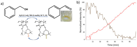 (a) Reaction conditions for benzyl alcohol oxidation. (b) Evolution of the normalized integration of the infrared spectra of benzylic alcohol and benzaldehyde during the oxidation reaction of benzyl alcohol (black curve) into benzaldehyde (red curve) over time.