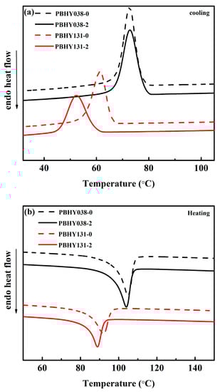 The obtained copolymers were dissolved in 30 mL of decalin at 90 °C. After cooling to room temperature, N,N-dimethylformamide, thioglycerol, and trimethylamine were added to the reaction system. The mixture was reacted at 70 °C for 50 h. The obtained butene-1 copolymers with hydroxyl groups were precipitated out by pouring the reaction mixture into a large amount of ethanol. The polymers were washed repeatedly with acetone. After drying under a vacuum at 40 °C for 24 h, the functionalized polybutene-1 with hydroxyl groups was obtained [51]. In addition, thioglycerol was substituted by 1-propyl mercaptan in the same way to prepare the reference polymer with a similar branch length but no hydroxyl group (Scheme 1). 1H NMR results show that the reaction was complete (Figure S1b,c). The obtained polymers with and without hydroxyl groups were referred to as PBHY-2 and PBHY-0, respectively, for which the number in the sample code corresponds to the number of hydroxyl groups in each branch (see Table 1).