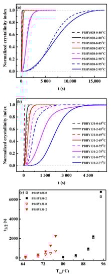 The DSC isothermal curves of copolymers with incorporations of (a) 0.38 and (b) 1.31 mol% at different temperatures. (c) The determined half-crystallization time (t1/2) as a function of isothermal temperatures.