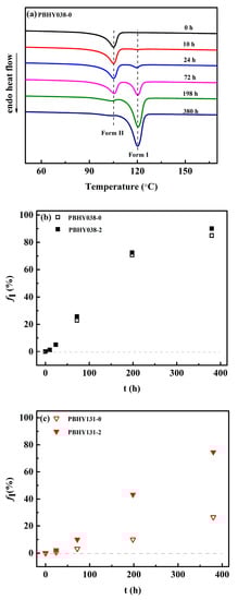 Although the crystallization temperatures were dependent on the incorporation and type of functionalized groups, the resulting crystallites were all of thermally metastable tetragonal form II (Figure S2), which tends to spontaneously transform into the more stable trigonal form I. To study the influence of hydroxyl groups on the phase transition from tetragonal form II to trigonal form I, the generated form II crystallites were aged at 25 °C for various durations and then heated to determine the fraction of transformed form I in the total crystallites, since form I has a higher melting temperature than form II. Figure 4a first shows the DSC heating curves of polymer PBHY038-0 after annealing at 25 °C for different times. It was seen that, without annealing, only a single endothermic peak of form II was observed in the heating curve. However, after annealing for 10 h, one additional distinct endothermic peak appears, which corresponds to melting of the transformed form I [48,56]. As the annealing period was further extended, the endothermic peak of the transformed form I increased whereas that of the residual form II decreased correspondingly. The fraction of transformed form I can be quantified from the DSC results with the following equation: , where and represent areas of endothermic peaks during melting of form I and form II, respectively, and and are the crystal melting enthalpies of pure forms I and II, 141 and 62 J/g, respectively [28]. Figure 4b,c compare the evolution of fractions of transformed form I with and without hydroxyl groups for two distinct incorporations of 0.38 and 1.31 mol%, respectively. When the incorporation is low, only 0.38 mol%, the kinetics of the phase transition with hydroxyl groups are comparable with those without hydroxyl groups (Figure 4b). As the incorporation increased to 1.31 mol%, the II–I phase transition with hydroxyl groups is higher than that without hydroxyl groups and the difference increases with the phase transition. It was indicated that the presence of hydroxyl groups could accelerate phase transition for the high incorporation of 1.31 mol%.