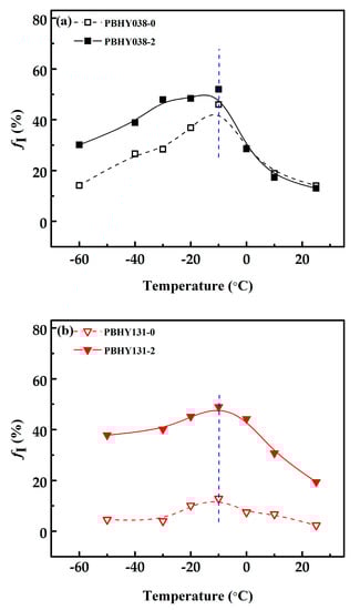 It has been recognized that solid II–I phase transition is implemented as a two-step process, triggered by nucleation and subsequently implemented by the growth of form I within the initial lamellae [57,58]. Moreover, it has been reported that the kinetics of II–I phase transition is determined by the nucleation step [56,59,60,61]. In this case, the kinetics of the phase transition is strongly dependent on the nucleation temperature. The lowered temperature could increase the temperature difference between crystallization and nucleation, which increases the internal thermal stress originating from the various thermal expansion coefficients between the crystal and amorphous regions, and might also decrease the critical nuclei size for the newly appeared phase. To examine the relationship between phase transition kinetics and the transition temperature, the form II crystallites were cooled to various temperatures for a fixed duration of 30 min to allow for nucleation and were subsequently aged at 25 °C for the transition. Due to the different kinetics, the transition periods were chosen as 50 and 120 h for 0.38 and 1.31 mol%, respectively. From Figure 5, it can be clearly seen that, irrespective of the presence of hydroxyl groups, the maximum peak of transformed form I is observed at ‒10 °C, indicating an identical optimal temperature for nucleation. In addition, this optimal temperature remains unchanged when increasing the incorporation from 0.38 to 1.31 mol%, which is the same as for the nucleation temperature in polybutene-1 homopolymer [56].