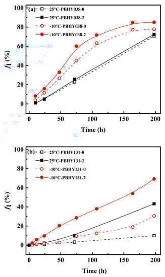 The fractions of the form I transformed at room temperature after initial nucleation at −10 °C for 30 min in (a) PBHY038 and (b) PBHY131. The thermal protocol was illustrated by Scheme 2c.