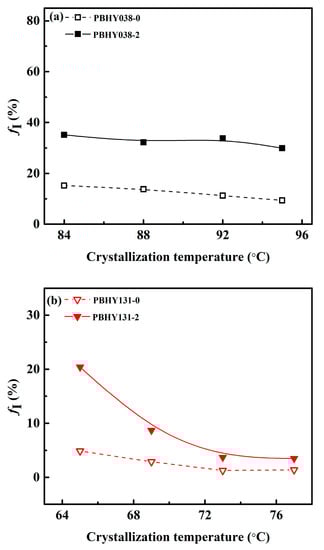 The above results focus on the influence of transition conditions on the transition kinetics. It should be noticed that the structural characters of the initial form II that are transformed are strongly dependent on the crystallization process from amorphous melting to the ultimate solid. It was recently reported that the temperature used to prepare the initial crystallites not only determines the transition conditions to influence the internal stress but may also vary the number of intercrystalline links, which plays an important role in the stress transport between lamellae [47]. Note that the initial form II crystallites studied in the above sections were all prepared by a cooling process, where there is a difference in the crystallization temperature between PBHY131-0 and PBHY131-1 (Figure 1). To know the dependence of II–I transition on the crystallization temperature, the form II crystallites to be transformed were prepared at various temperatures. Figure 7 shows the fractions of transformed form I as a function of isothermal temperature of form II preparation. It was observed that the fraction of transformed form I increases slightly with decreasing temperature for a low incorporation of 0.38 mol% (PBHY038-0 and PBHY038-2, shown in Figure 7a) and a high concentration of 1.31 mol% without a hydroxyl group (PBHY131-0, shown in Figure 7b). However, PBHY131-2 with substantial hydroxyl groups shows increased transformed form I when lowering the form II preparation temperature. This means that the influence of hydroxyl groups on II–I transition kinetics becomes weaker at elevated temperatures. The increase in transition kinetics with lowering crystallization temperature was also observed in polybutene-1 ionomers with the physical ion aggregates [48]. It was indicated that the hydroxyl groups may form some hydrogen-bonded nanoclusters, similar to ion aggregates, which act as additional physical crosslinks to enhance internal stress to the lamellae for form I nucleation within form II. In summary, in the presence of polar hydroxyl groups, the solid II–I phase transition could be more efficiently accelerated by lowering the crystallization temperature of preparing form II.