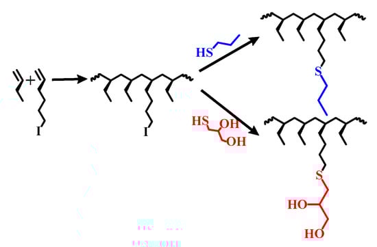 The polymers studied in this work were functionalized polybutene-1 with and without hydroxyl groups. All synthetic experiments involving air- and/or moisture-sensitive compounds were carried out in a MBraun glovebox, filled with nitrogen and using the standard Schlenk technique. The diemethyl (pyridylamido) hafnium pre-catalyst and the 6-iodo-1-hexene comonomers were synthesized according to [49,50]. The toluene used was purified by an Etelux solvent treatment system. Butene-1 gas and ultrahigh-purity nitrogen were obtained from Tianjin Liufang Industrial Gas Distribution Co., Ltd. (Tianjin, China). Triisobutylaluminum (Al(iBu)3, 1.1 mol/L in toluene), the tritytetrakis (pentauorophenyl) borate ([Ph3C] [B(C6F5)4]) cocatalyst, trimethylamine, 1-propanethiol, and monothioglycerol were purchased from J&K China Chemical, Ltd. (Beijing, China) and used without further purification. The synthetic routes of the butene-1/6-iodo-1-hexene copolymers and functional polybutene-1 are shown in Scheme 1.