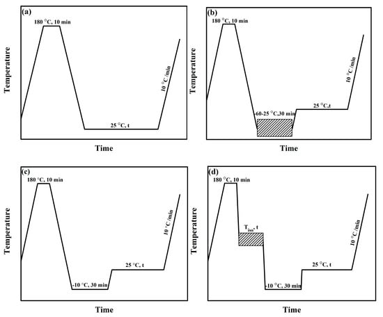 Schematic illustrations of the thermal protocols applied in this work to study (a) phase transition kinetics at room temperature, (b) dependence of phase transition on nucleation temperature, (c) phase transition kinetics with the optimized nucleation step, (d) dependence of phase transition on the form II crystallization temperature.
