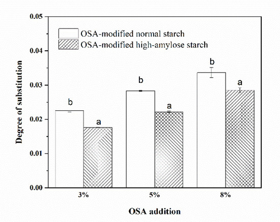 Degrees of substitution of normal and high-amylose Japonica rice starches after octenyl succinic anhydride (OSA) modification. At a specific OSA addition, bars with the same letter were not significantly different (α = 0.05).