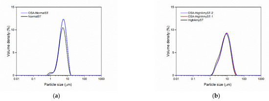 Particle size distribution curves of normal (a) and high-amylose Japonica rice starches (b) with and without OSA modification. NormalST: native normal starch; OSA-NormalST: OSA-modified normal starch (DS = 0.0283); HighAmyST: native high-amylose starch; OSA-HighAmyST-1: OSA-modified high-amylose starch (DS = 0.0177); OSA-HighAmyST-2: OSA-modified high-amylose starch (DS = 0.0285).