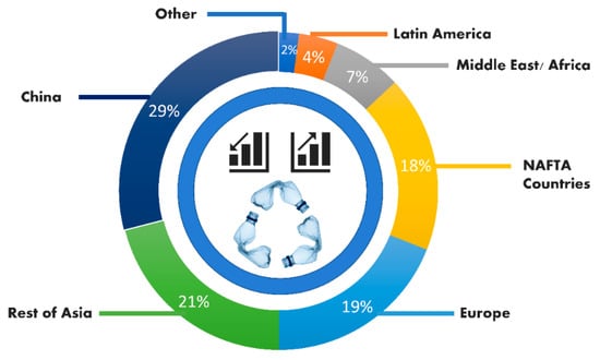Plastics are one of the present world’s largest innovations and widely used materials worldwide. Plastic demand has grown dramatically in the last 50 years, more than 322 Metric tons in 2015, with a projected doubling by 2035 [1,2,3]. According to an Australian plastics recycling study, overall use of plastics was 3.513 Million tons in 2016–2017, whereas only 0.42 Million tons were reused [4]. More than 30 million tons of plastic waste is generated in China annually [5]. In 2010, approximately 4.8 to 12.7 million metric tons of plastic were found in oceans [6]. The latest statistics of 2020 are presented in Figure 1. Asphalt mixtures have increasingly become an important material for roadway and airport pavement structures [7,8,9]. A kind of environmentally sensitive construction is flexible pavements. Pavement degradation can occur more quickly when environmental factors change adversely. Road authorities may incur extra costs to minimize the adverse changes in places where they will exist. If nothing is done, the road user will bear the costs in terms of fuel consumption, health and safety, and time. Additionally, surface cracks, rutting or reduced skid resistance are among the most common defects caused by an increase in the volume and intensity of traffic moving on highways [10]. Modified asphalt has played a vital role in reducing pavement-related issues by enhancing thermo–physical characteristics, which have an impact on the mixture’s final performance [11]. One of most popular ways to improve the performance of an asphalt mixture is to modify it with polymer [12,13]. In 1843, the first patent for incorporating polymers into asphalt was issued, and the first practical use of polymers in bitumen mix incorporation was found in the early 1990s [14].