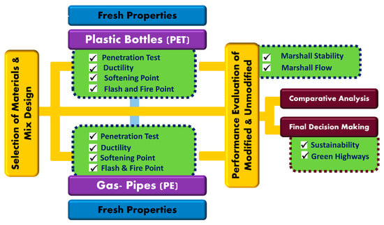 In preparing the modified asphalt samples, standard procedure was performed. To determine the physical characteristics of the pavement constituent materials, multiple tests were carried out and compared with control specimens. Moreover, waste plastic-based modified asphalt concrete were tested and compared with unmodified asphalt concrete samples as per recommended specifications. The complete research methodology has been presented in Figure 3.
