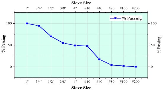 A sieve analysis test was performed to study and draw a particle size distribution curve for both aggregates, i.e., fine, and coarse aggregates as shown in Figure 4. This test is performed as per ASTM specification. The percentage passing of aggregate is then obtained to find out grain size distribution of aggregate used in this study. The properties of aggregate were analyzed and compressively tested in the laboratory. Results are presented along with their compliance standard and requirement in Table 2.