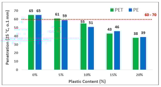 The bar chart illustrates the penetration value of both plastic contents in polymer-based modified bitumen in Figure 6. Overall, it can be seen that the maximum value of penetration stared at just over 5% and then falls dramatically to a value of 16% by 20% addition of plastic contents. A significant decrease in the value of penetration was due to addition of plastic contents which makes it more stiff and restricts its flow in varying climatic conditions which was also observed in these reports [41,42]. The reduction in penetration reading at 5%, 10%, 15% and 20% of PET content as compared to control sample was 6.2%, 11.8%,15.1% and 17%, respectively. Similarly, in the case of PPE contents, it was 11.0%, 12.7%,14.1% and 16% less as compared to neat binder.