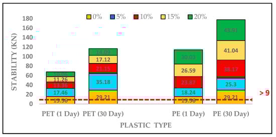 The Marshall stability values for PET- and PE-based asphalt mixture at 1 day and 30 day are presented in Figure 9. The stability value for both plastic contents at varying percentages were found to increase. The stability value improved with increasing in waste plastic contents for PET content and found 17.46, 13.36, 11.26 and 10.06 KN at 5%, 10%, 15%, and 20% replacement of PET contents, respectively. Additionally, the stability values of PE-based asphalt mixtures enhanced consistently from 18.24, 23.87, 26.59 and 30.03, respectively, after 1 day testing. The maximum stability value for PET content was observed at 5%. However, stability values obtained from PE-based asphalt mixture were greater as compared to PET-based asphalt mixture due to wider dispersion of gas pipes (PE) in PMB, which indicates more stiffness as well as increased stability.