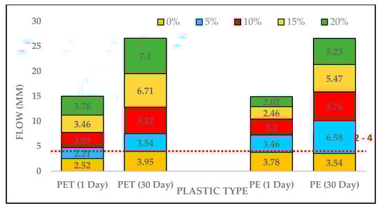 Flow values for PET-based asphalt concrete were elevated with increasing plastic contents as shown in Figure 10. Flow of 3.78 was observed at 20% replacement of PET which is higher than as compared to the control sample, but it was within the standard range. Similarly, a considerable increase in flow values of PMB for PET at 30 days were recorded. Additionally, flow values of PE-based asphalt mixture was within standard range after 1 day testing. On the other hand, flow values for PE content after 30 days testing was higher as compared to the control sample.