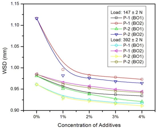 | Lubrication Condition | Weld Load (N) | Average Wear Scar Diameter | ||