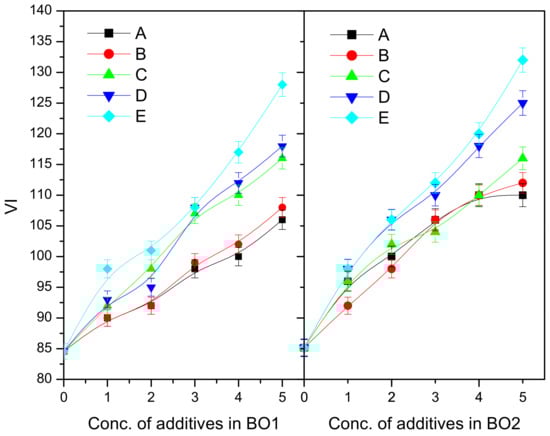 | Sample | Base Oils | VI of Lubricants with Additives at Different Percentages | ||||