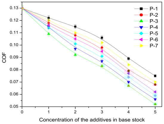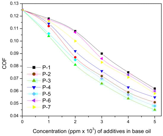 | Base Oil | Conc. (%) | Lubricants with Additives | ||||||