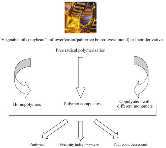 - Ghosh, P.; Upadhyay, M. Isodecyl acrylate-olive oil copolymers as potential biodegradable additive for lubricating oil. J. Polym. Res. 2016, 23, 100. [Google Scholar] [CrossRef]