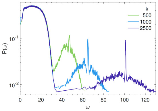 Figure 1 plots the vibrational density of states. Two main branches can be distinguished: A high-frequency one governed by the bonding interactions and a low-frequency one governed by non-bonding LJ interactions [29,31]. It is seen that changing the stiffness of the spring bonding adjacent monomers of the same chain, affects only—as expected—the high-frequency branch, leaving unaffected the low-frequency one. In accordance with this observation we note that the narrow peak appearing in between the two side lobes of the high-frequency branch is located at the characteristic frequency of the vibration of a dumbell with two monomers coupled by a spring, (4 k/m). To date, the low-frequency branch of vDOS attracted most interest since it is involved in thermodynamic anomalies of amorphous solids [1]. On the other hand, the high-frequency branch observed in polymeric glasses [29,31] deserves wider attention. As an example, we mention the class of shape memory polymers where the presence of hard and soft domains has been reported [32,33].