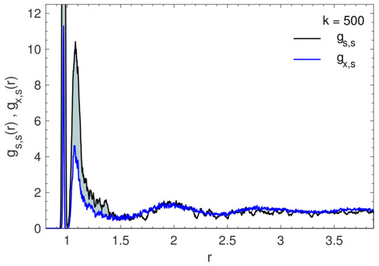 Radial distribution functions and . . The grey region emphasizes the tendency of a central soft monomer to be surrounded by more soft particles than a generic one in the first coordination shell.