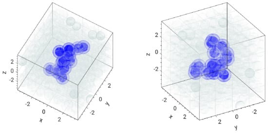 Two views of a snapshot of a typical large soft cluster composed of 15 monomers. Bond strength . Gyration radius , principal values of the inertia tensor , , and . The blue color corresponds to particles with unit diameter (the approximate monomer diameter). Two soft monomers are defined as “close”, and then belongs to the cluster, if their surrounding lighter regions superimpose, i.e., their mutual distance , see Figure 4.