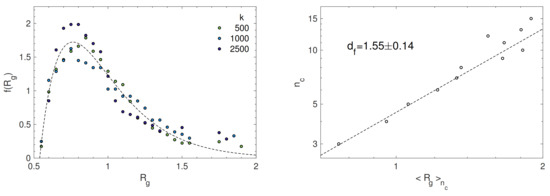 (Left) distribution of the radius of gyration of soft clusters. The dashed line is a guide for the eyes. (Right) correlation plot between the number of members of a cluster and the gyration radius averaged over all the clusters with the same number of members, . The dashed line is the best-fit curve with the power-law, Equation (13), by adopting a linear least-squares procedure with weights proportional to the number of clusters involved in each average to draw . The resulting fractal dimension is . If no weight is used, one finds .