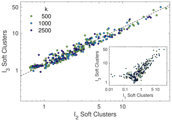 where A is a constant. We follow two different approaches for the best-fit procedure. In one case, the least-squares are weighted with the number of clusters involved in the average . This leads to . On the other hand, with no weight, the fit procedure yields . The fractal dimension points to a soft cluster, which is open and tenuous [35]. Indeed, the largest identified soft cluster exhibits a loose structure, see Figure 5.