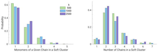 Finally, Figure 9 analyzes the relevance of the single chain contribution to a given cluster and the role of different chains in the formation of a single cluster. Even in this case the dependence on the strength of the bonding interaction is not apparent. Figure 9 (left) shows that about up to three soft monomers of a given cluster belonging to the same chain. Interestingly, Figure 9 (right) evidences that a single cluster is rarely populated by monomers of a single chain, being the most frequent occurrence the involvement of 2–3 different chains.