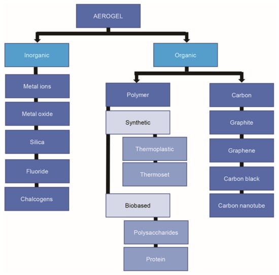 An aerogel is a synthetic, porous, and ultra-light material derived from a gel in which the liquid of the gel is replaced with a gas and its structure is maintained. About 99% of the aerogel is air, which makes it the lightest material on Earth [1,2,3,4,5]. Aerogel development was started in 1931 by Klister, and since then the definition of aerogel has become broader. Aerogel-forming materials can be manufactured using inorganic compounds, organic polymers obtained from polysaccharides and proteins, synthetic polymers, or a mixture of organic and synthetic polymers [1,6,7,8,9]. Hence, aerogels can be broadly classified as inorganic and organic according to their precursors, as shown schematically in Figure 1, where the polysaccharides are classified as a biobased organic polymer source. The organic polymer sources also include synthetic polymers, which are subdivided into the thermoplastic and thermoset polymers. In addition, aerogel structures can be classified according to their pore diameters as mesoporous (2–50 nm), microporous (<2 nm), or macroporous (>50 nm) [10]. As discussed in the literature, any highly porous material with a three-dimensional (3-D) network of gas, low density, and large inner surface area is considered to be an aerogel. The density of an aerogel can be as low as 0.004–0.5 g/cm3 with a high porosity of up to 99.8% and a large specific surface area of 100–1600 m2/g [11]. Due to these properties, the aerogels have been applied as adsorbents of CO2 [12,13,14,15,16], dyes, and heavy metals [2,3,11,17,18,19,20,21,22,23], as tissue engineering and blood system scaffolds in the biomedical field [3,22,23,24,25,26,27], and as materials for thermal insulation [4,28,29,30,31,32,33,34,35,36] and food packaging [37,38,39,40,41]. These versatile materials also exhibit high optical transparencies, low thermal conductivities (down to 12 mW/mK) and low sound speeds [42,43]. Moreover, they exhibit outstanding properties such as high strengths, high thermal isolations, and low dielectric constants, making them suitable for applications that involve heating elements [30,31].