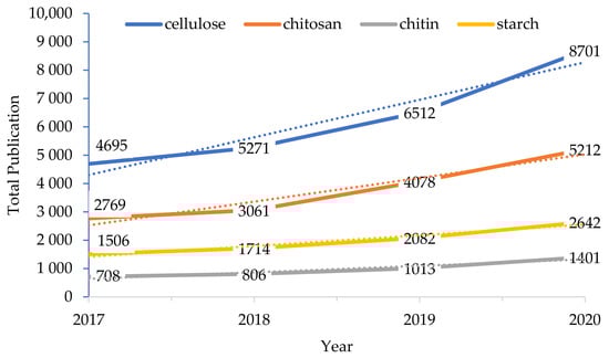 More recently, there has been a growing interest in the development of bio-aerogels from natural polysaccharides due to their enhanced biosafety, availability, and biodegradability compared to those of inorganic and organic chemicals [1,6,44]. These promising materials are derived from naturally occurring polymers and biopolymers, which are found abundantly in natural structural building blocks. Natural polysaccharides contain crystalline and amorphous regions that are highly susceptible to hydrolysis. Various polysaccharides can be used to produce aerogels, including cellulose [24], starch [45], alginate [46], pectin [47], lignin [29], collagen [48], and chitosan [44]; however, cellulose and chitosan/chitin are the most commonly used and have therefore attracted current research interest. This is reflected in the plot of four types of polysaccharide gel reported in the literature against the year of publication in Figure 2, where cellulose is seen to be the most reported since 2016.