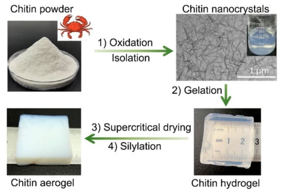 The fabrication of a chitin aerogel from chitin powder via an oxidation of the powder, isolation of chitin nanocrystals, gelation at an acidic condition, supercritical drying, and silylation process is shown in Figure 3. During the oxidation process, the chitin powder was treated using 2,2,6,6-tetramethylpiperidine-1-oxyl (TEMPO), sodium bromide (NaBr) and sodium hypochlorite (NaClO) as a catalyst to produce carboxylate groups. The pH of the solution rendered basic by introducing NaOH prior to quenching with ethanol and several cycles of centrifugation to remove all impurities. The resulting chitin nanocrystals in needle shapes with lengths of 100–400 nm and a width of 20 nm were treated with hydrochloric acid vapor for their surface carboxylates to induce gelation in acidic conditions [4].