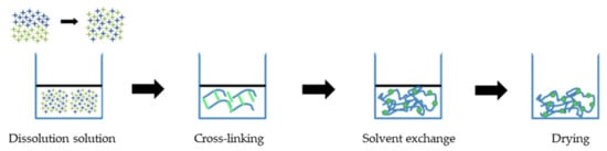 Aerogels can be prepared directly from polysaccharide nanocrystals or polysaccharide nanocrystal composites with other polymeric matrices. The purpose of crosslinking is to improve the final mechanical properties of the aerogel [49]. For example, single cellulose is generally difficult to melt and dissolve due to its mixed crystalline and non-crystalline structure, molecular chain rigidity, and strong intra- and inter-molecular hydrogen bondings due to the –OH functional groups in the molecular chains [18]. Hence, the direct preparation of natural polysaccharide nanocrystals is difficult, except via layer-by-layer assembly [17].