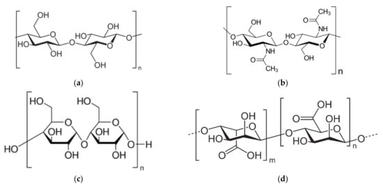 Figure 5. Structural formulae of (a) cellulose, (b) chitin, (c) starch, and (d) alginate.