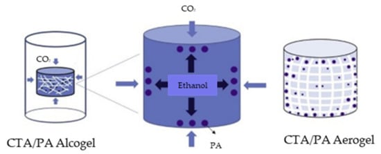 The formation and sc-CO2 drying of a cellulose triacetate (CTA)/paracetamol(PA) aerogel is shown schematically in Figure 7. First, the CTA/PA aerogel was dissolved in ethanol to produce a homogeneous mixture and allow the polymer gel to form. The polymer gel was then dried under sc-CO2 at 15 MPa and 40 °C without changing the solvent. During the drying process, the aerogel was observed to shrink due to the low capillary force between the CTA and solvent.