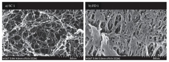 Both the sc-CO2 and freeze drying (FD) methods are widely used to produce aerogels; however, each process has its own advantages and disadvantages, such that the method of choice depends on the specific requirements and intended application of the aerogel. To illustrate this, the structures of polyurea obtained via sc-CO2 drying and FD are compared by the scanning electron microscopy (SEM) images in Figure 8 [103]. Here, the sc-CO2 drying is seen to provide a homogeneous fibrillar structure, whereas the FD results in a denser structure with high fiber aggregation caused by the growth of large solvent crystals during freezing. This is because the liquid solvent diffuses from the smaller pores to the larger ones during the FD process, thus causing tension in the walls of the larger pores and generating a denser fiber network. Conversely, the sc-CO2 drying process provides a finer pore size and a narrower pore-size distribution due to the absence of any apparent or occasional aggregation of the fibers at low concentration and to the absence of surface tension which prevents the collapse of the pores during solvent elimination [97]. Thus, the sc-CO2 drying provides a well-defined structure by preventing shrinkage or collapse of the mesopores during drying. However, the sc-CO2 drying is performed under high temperature and pressure, consumes a large amount of solvent, and requires a significant amount of time for the exchange of solvents, thus increasing the overall cost [1]. Thus, the sc-CO2 process is more expensive than the FD process [103]. These factors also make it difficult to scale up the sc-CO2 drying process to either the pilot or industrial scale. Further, the sc-CO2 drying process produces aerogels with smaller macropores than those obtained via FD. In terms of the mechanical properties, the compressive strength of the CNF aerogel product obtained via freeze drying is greater than that obtained via sc-CO2 drying due to the formation of the ice crystals that enhance the internal structure of the aerogel via cellulose aggregation [104]. Moreover, the FD method is more favorable due to its ease of application, environmental friendliness, and cost effectiveness. The aerogel from FD shows a higher shrinkage, higher pore volume, low specific surface area, and low density. For instance, Czlonka et al. (2018) demonstrated that the FD aerogels shrank by 10–12% whereas the sc-CO2 aerogels shrank by only 8–9% [103]. In another study, the aerogel obtained via sc-CO2 was shown to have a lower density (0.009–0.05 g/cm3) and higher surface area (72–115 m2/g) compared to that obtained via the FD process [105]. Nevertheless, the FD process is also time consuming due to the long aging period of more than 2 days. Moreover, the FD process causes the destruction of the network structure during the crystallization of the pore liquids [106]. To resolve this issue during the fabrication of cellulose aerogels, a study was conducted to address the limitations of the process under ambient pressure by introducing naphthalene crystals to promote pore formation [106]. Nevertheless, both of these traditional techniques suffer from the lack of reproducible customization of the 3-D aerogel structures and the lack of easy fabrication of complex structures. One possible solution to these limitations is to combine the process of freeze drying with that of cross-linking. This novel approach can offer additional advantages, as reported by Autissier et al. (2010). In his study, a polysaccharide gel solution was freeze dried in the presence of a 30% w/v sodium trimetaphosphate cross-linking agent and the drying pressure was adjusted to facilitate cross-linking of the polysaccharides and, thus, induce porosity without the need of a solvent. Thus, the use of organic solvent was reduced while controlling the porosity and architectural structure of aerogel [102]. A comparison of the effects of the hydrogel concentration (1–2 wt.%) upon the formation of a lupin hull cellulose nanofiber aerogel has been performed using both the scCO2 and FD processes. The results indicated that the lowest density (0.009–0.05 g/cm3) was obtained for the aerogel made from the lowest initial hydrogel concentration of 1 wt.%, but the surface area was relatively high (72–115 m2/g) [105].