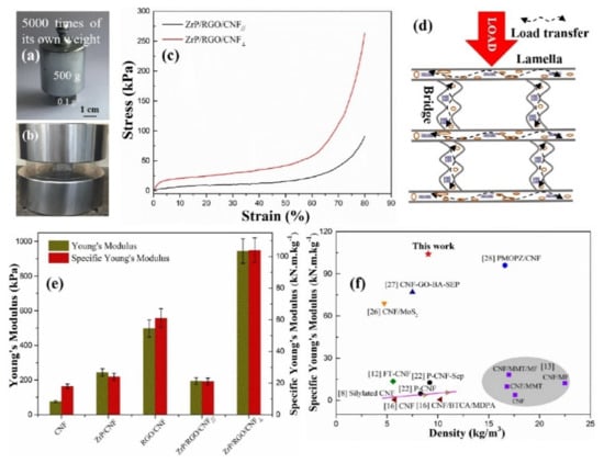 Figure 9. Mechanical properties of biomimetic–structural ZrP/RGO/CNF aerogel. (a) Optical image of an aerogel sample. (b) Photograph of a cubic sample in the compressive test. (c) Stress–strain curves of aerogels under different compression loads, perpendicular and parallel to lamellar alignments. (d) Schematic illustration of the load transfer perpendicular to lamella alignments throughout aerogel. (e) Young’s modulus of aerogels. (f) The comparison of specific Young’s moduli of ZrP/RGO/CNF aerogel with other cellulose nanofiber-based aerogels from previous work. Reproduced from reference [112] with permission. Copyright 2020 Elsevier.