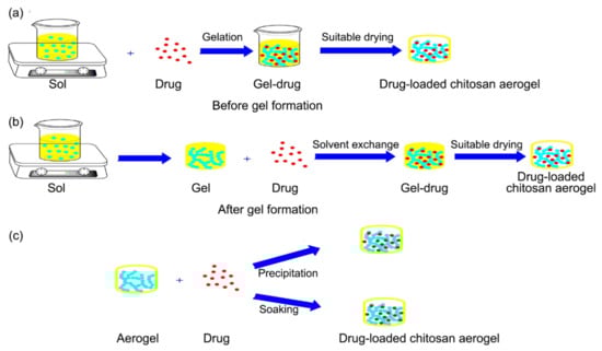 Figure 10. Drug-loaded chitosan aerogel: drug adding (a) before gel formation, (b) after gel formation, and (c) the addition of drug during adsorption/precipitation in the as-prepared chitosan aerogels. Reproduced from reference [64] with permission. Copyright © 2020 Elsevier.